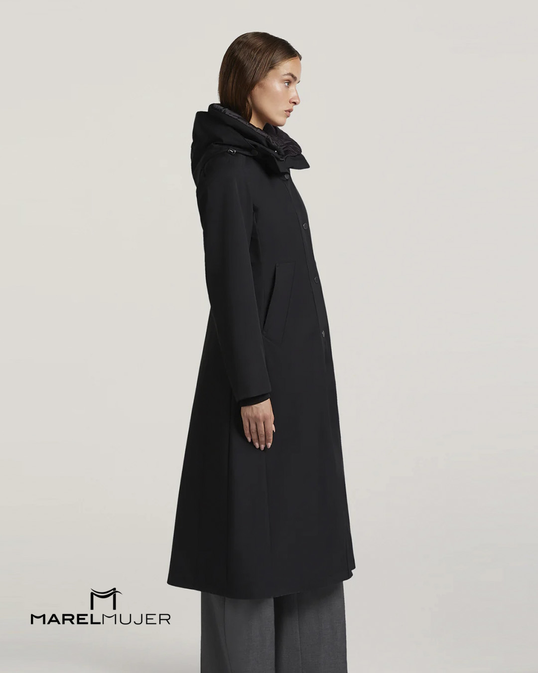 Este icónico y elegante abrigo largo está confeccionado en sarga elástica funcional, lo que ofrece libertad de movimiento sin sacrificar el estilo.