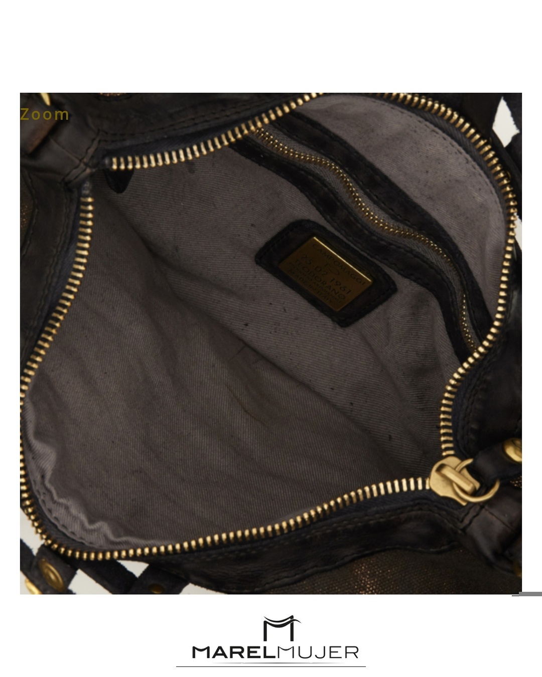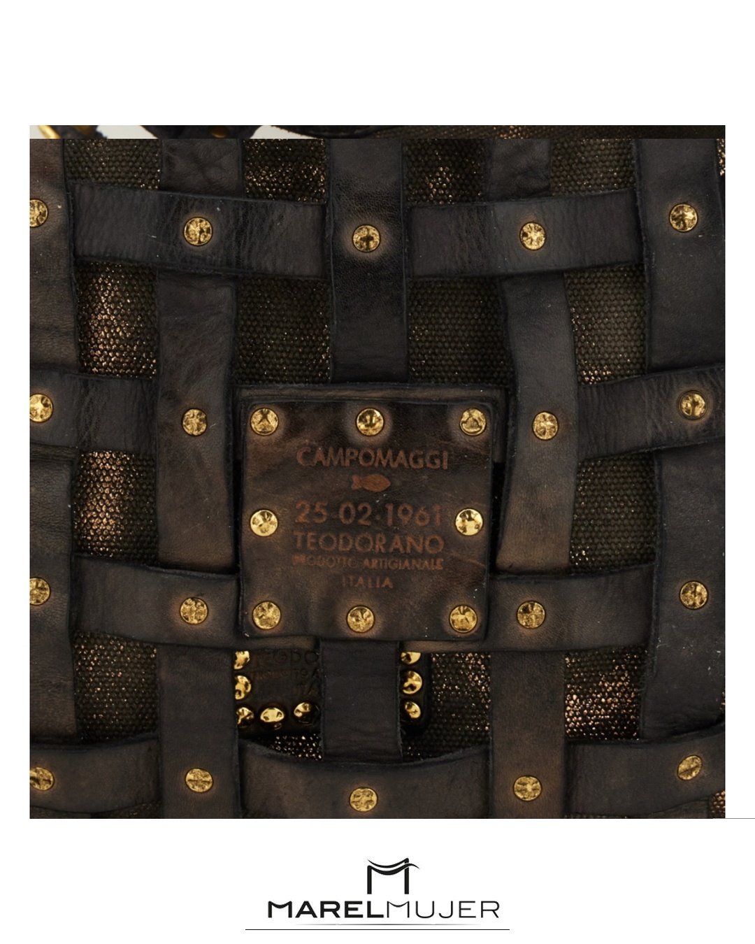 Bolso grande de piel con fondo de tela en dorado , de rejilla en color negro de CAMPOMAGGI