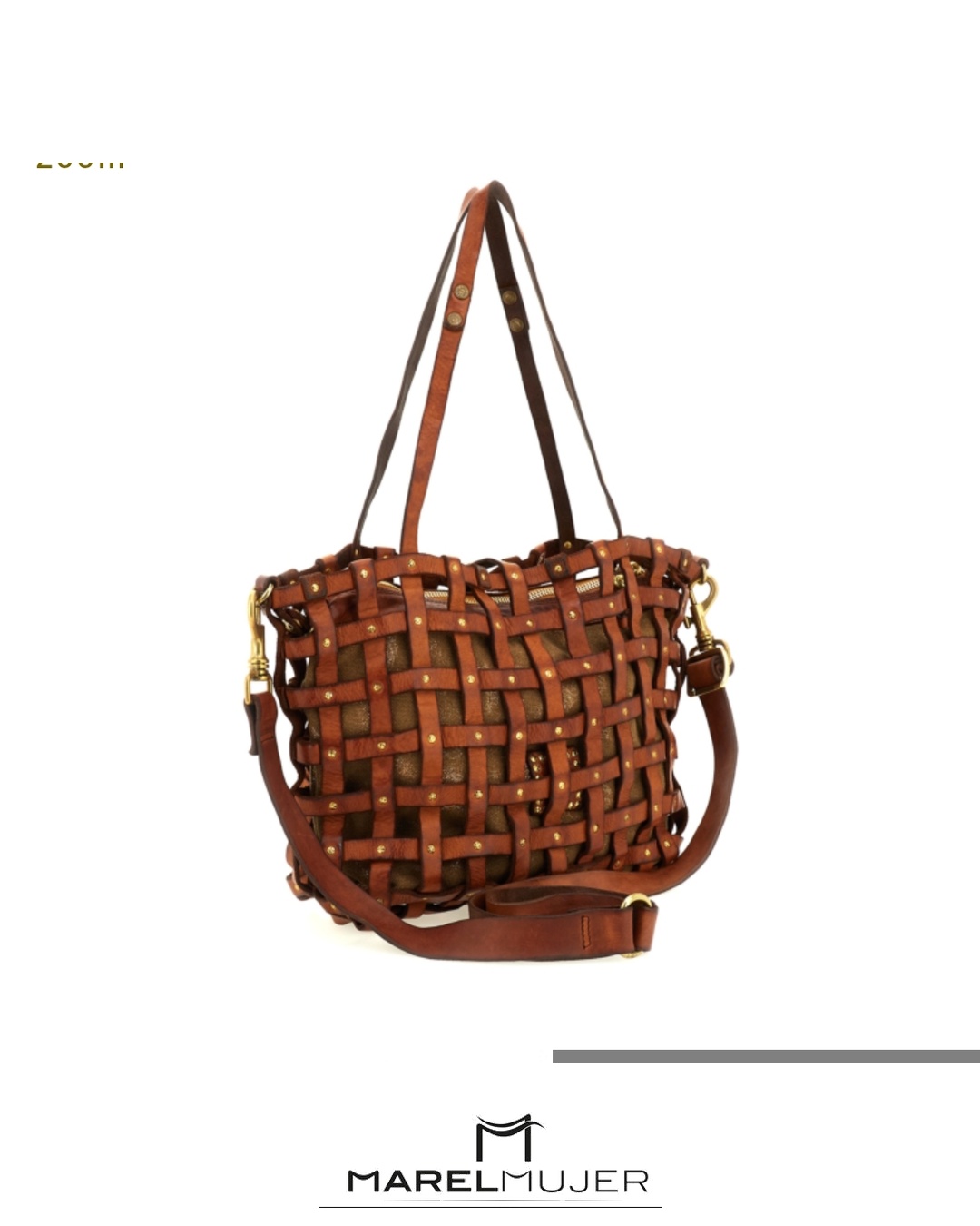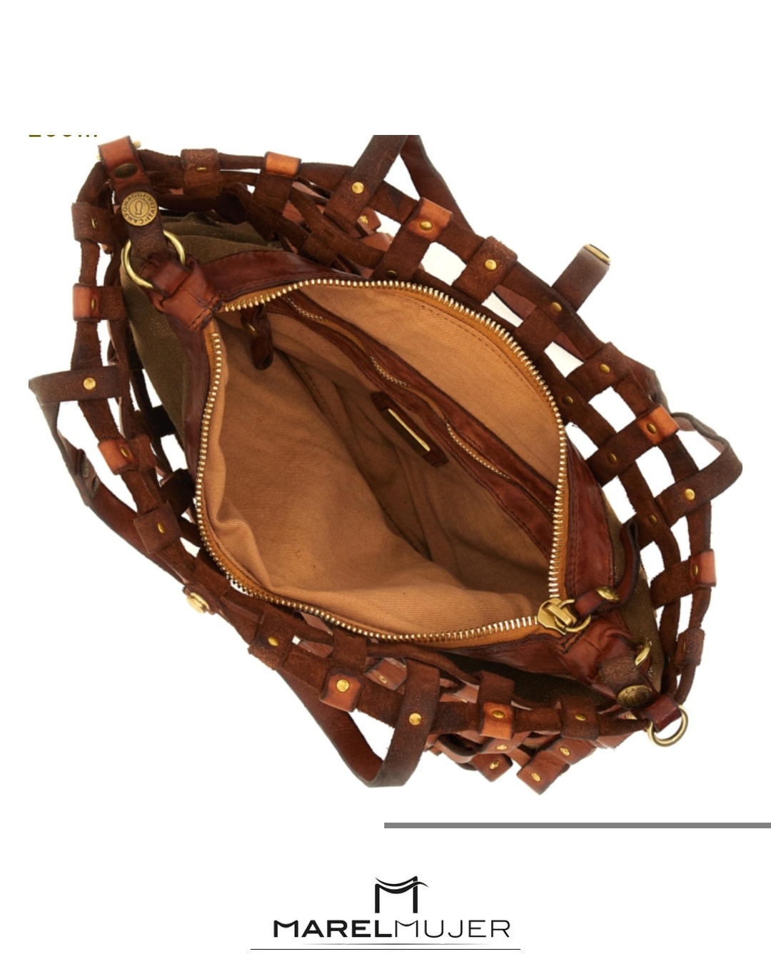 Bolso grande de piel con fondo de tela en dorado , de rejilla en color camel de CAMPOMAGGI