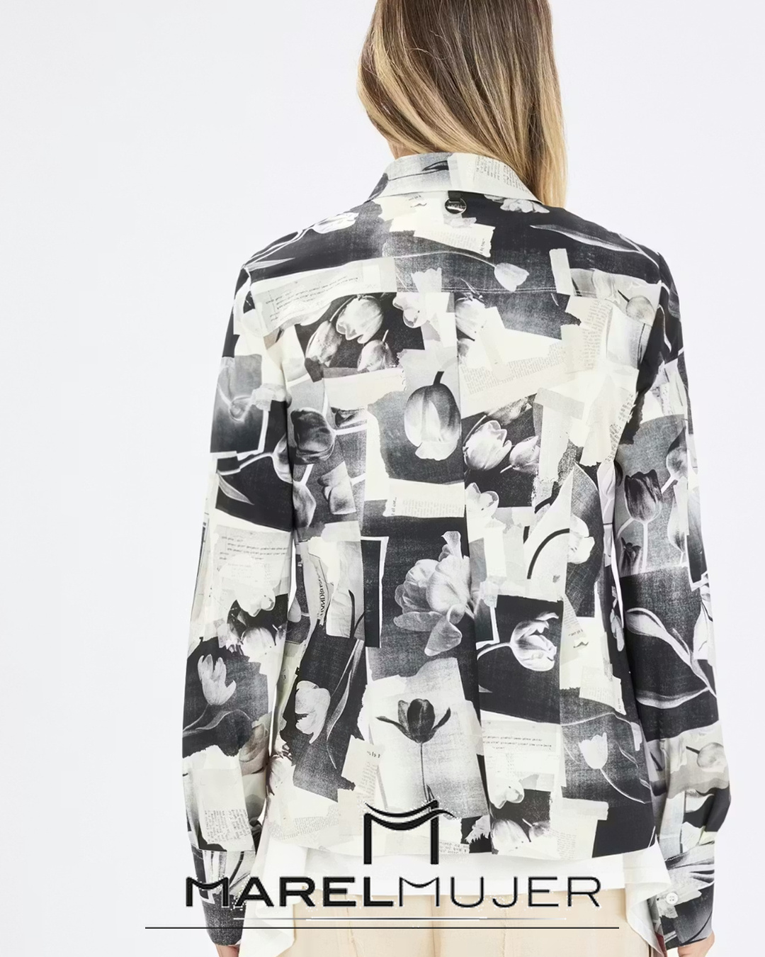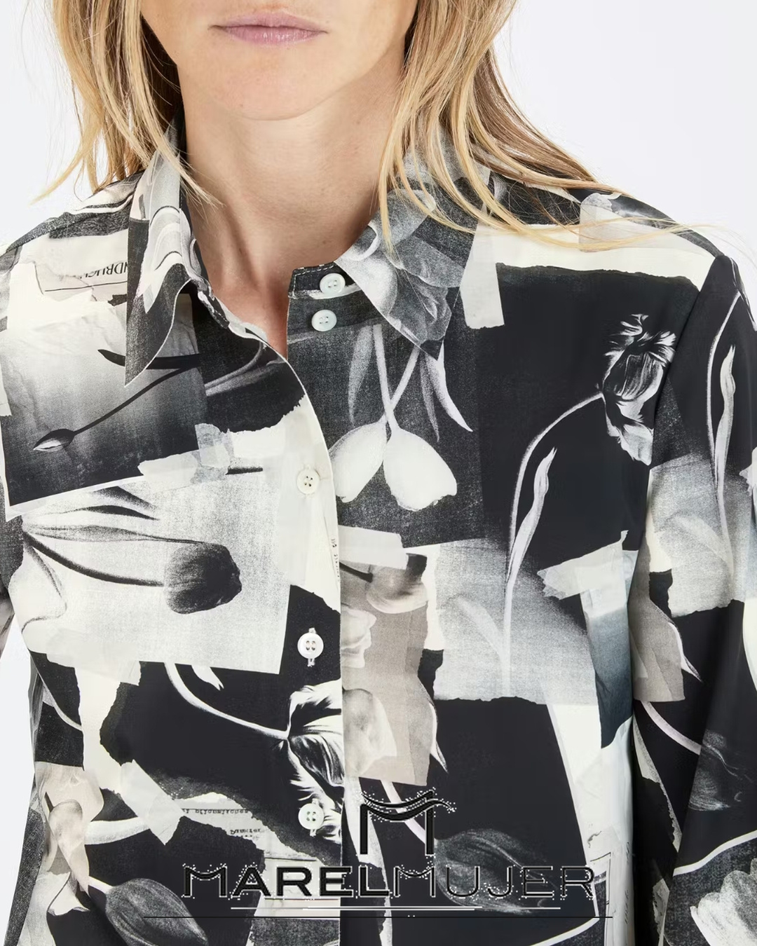 Camisa elástica estampada en blanco y negro con detalles de flores de HIGH