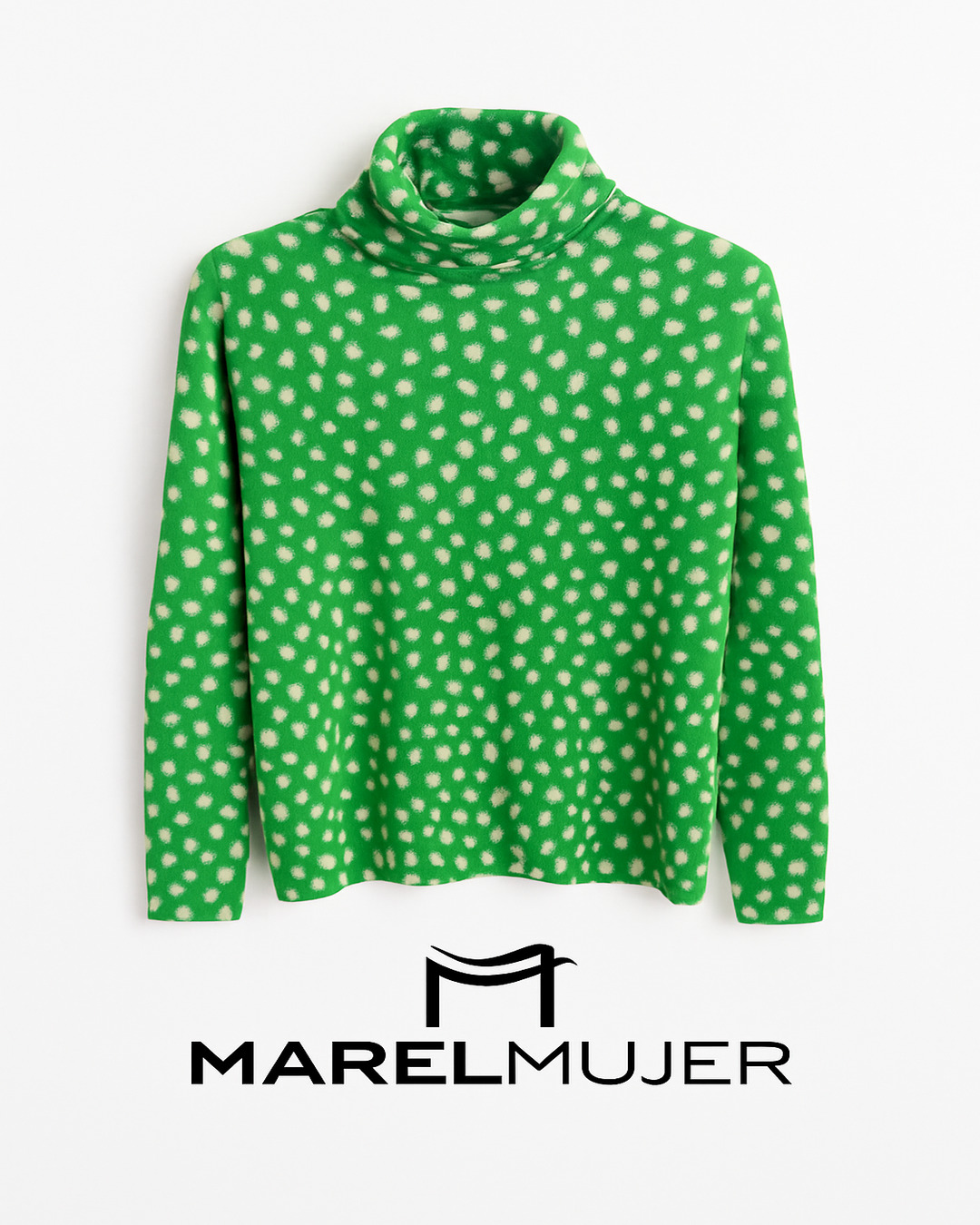 Jersey cuello alto fluido de lana merino en tono verde con topos en blanco