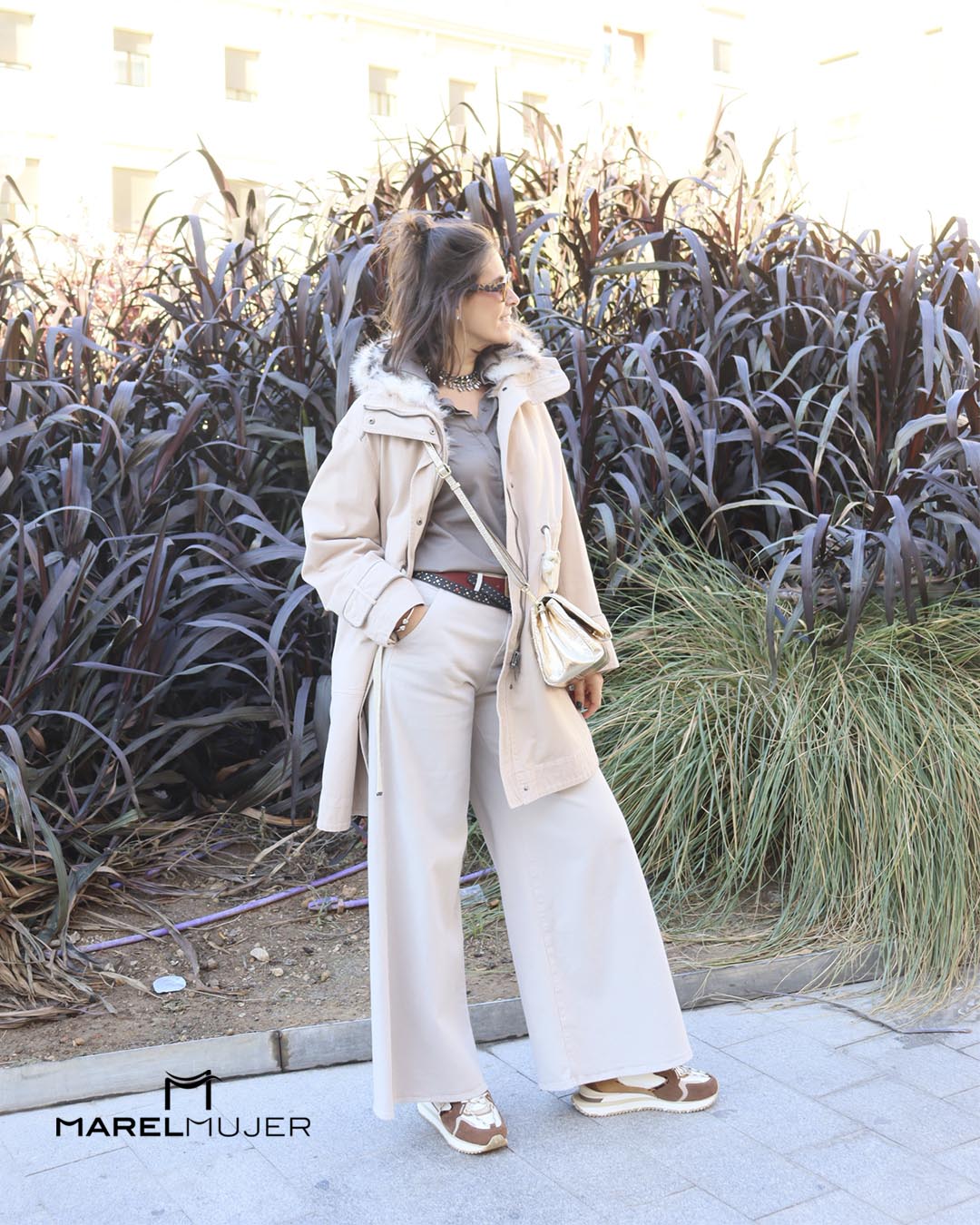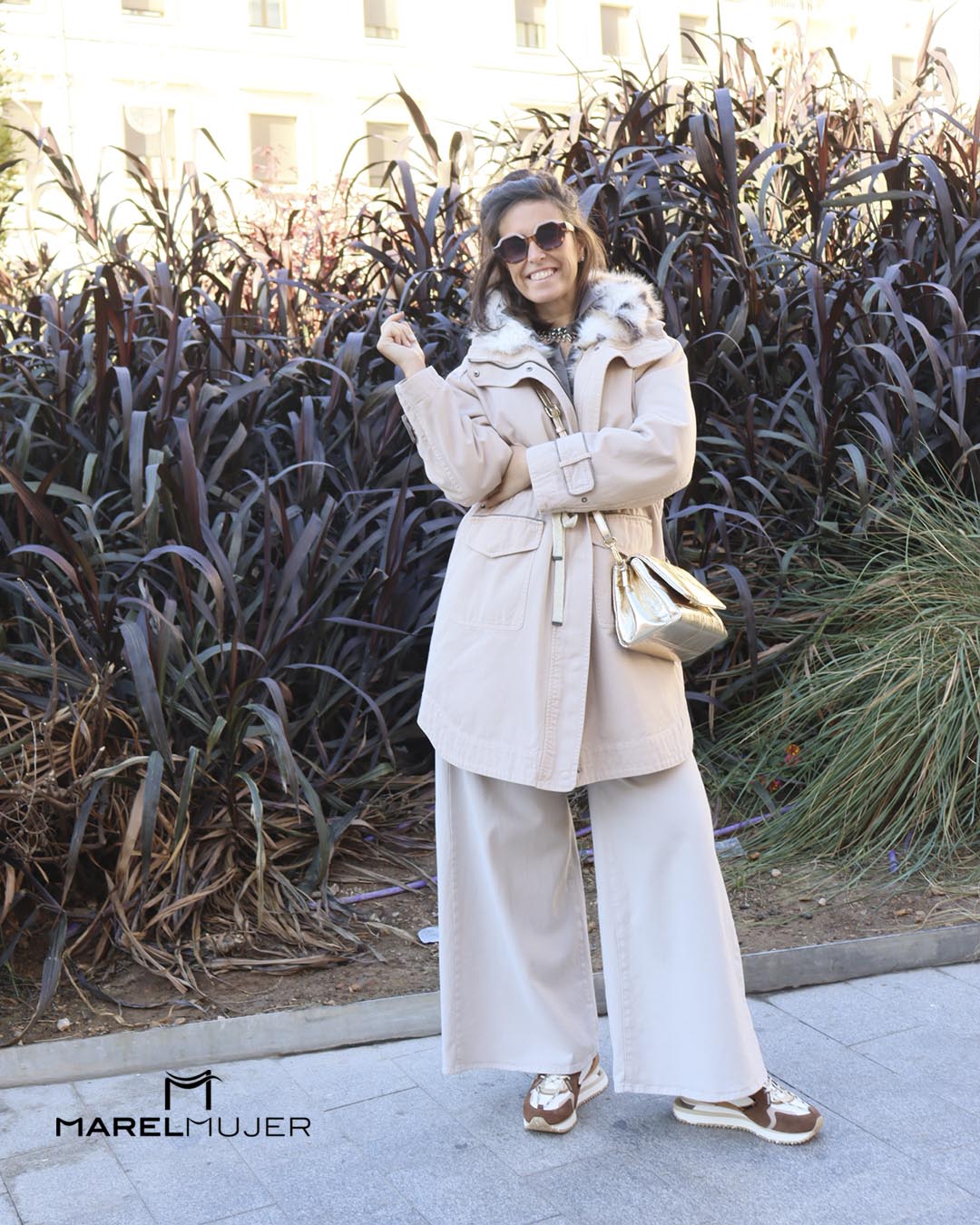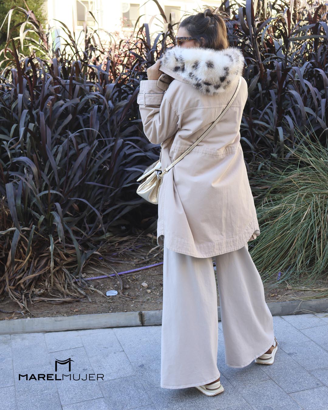 Parka larga en tonos claros con pelo ecológico de lince en capucha y parte delantera