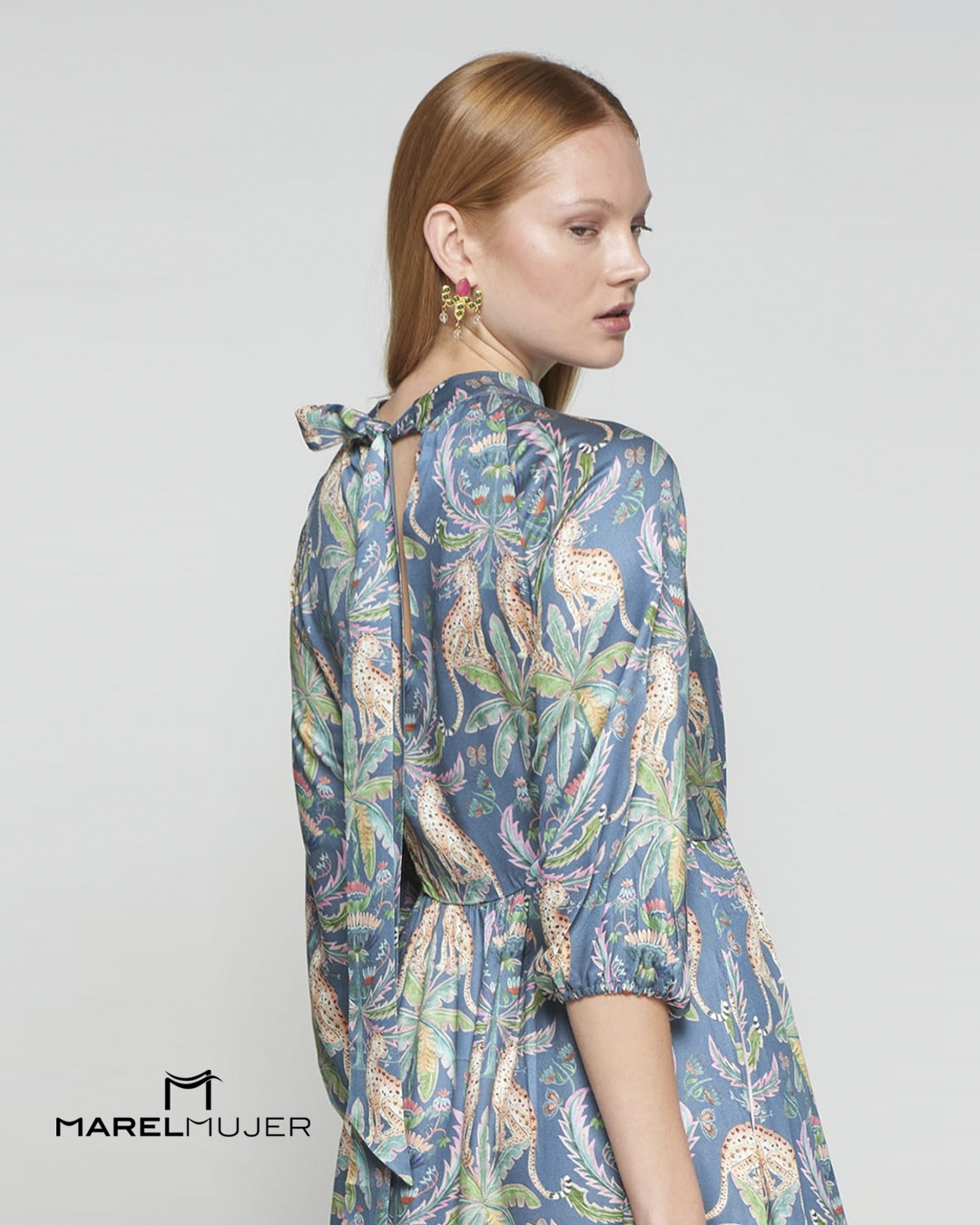 Vestido fluido con fruncido en cintura y estampados de tigres
