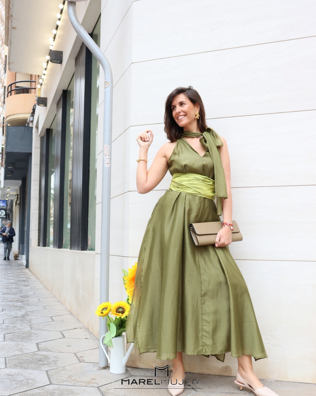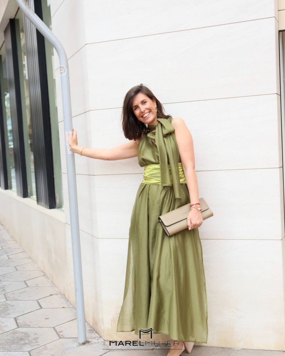 Vestido largo fluido de cuello halter con detalle de lazo largo